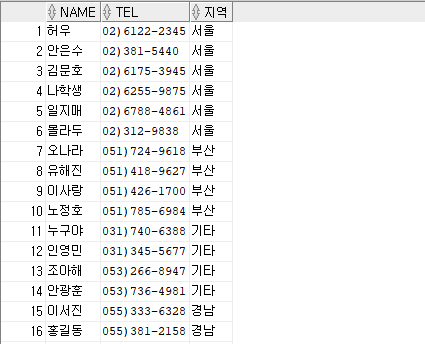 Quiz 학생의 이름 전화번호 지역명 출력하기. 지역명은 전화번호의 지역 구분이 02이면 서울, 051이면 부산, 052이면 울산, 055면 경남 그외는 기타