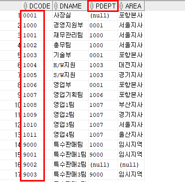 즉, 위의 표에서 2행의 경영지원부의 부서코드는 DCODE는 1000 / 상위부서코드는 PDEPT 는 0001입니다.