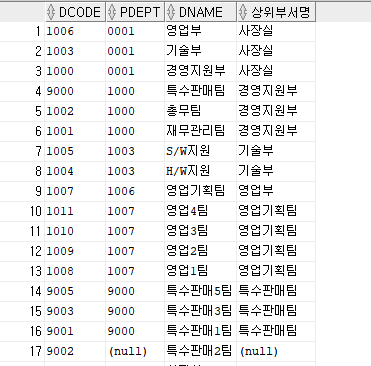 따라서 복사된 같은 테이블에서 PDEPT에 해당하는 부서명을 출력하면 상위부서명이됩니다.