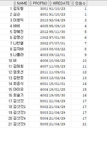 select p1.name, p1.profno, p1.hiredate, count(p2.name) "인원수"