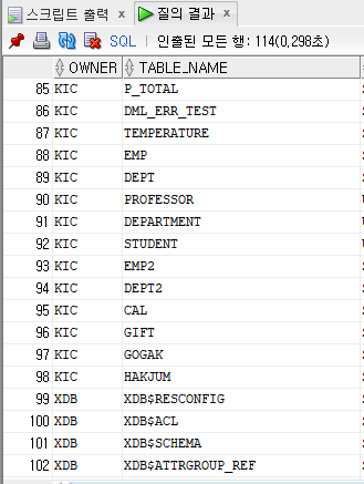 - 해당 데이터베이스의 저장되어 있는 모든 테이블을 조회할 수 있는 쿼리문입니다.