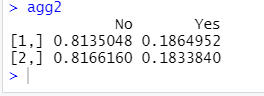 agg2 <- agg[,2] # ncol에서 agg는 2개 열인데 뒤에 열이 x로 묶인 no / yes 가 하나의 2번째 열이다