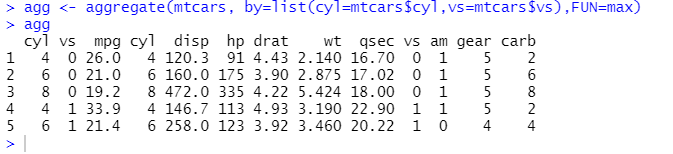 agg <- aggregate(mtcars, by=list(cyl=mtcars$cyl,vs=mtcars$vs),FUN=max)