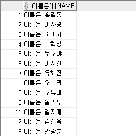 - Quiz '이름은 '이라는 리터럴을 NAME 컬럼에 연결하여 조회하기