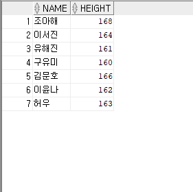 - Quiz 학생의 키가 150 이상 170 이하인 학생의 이름과 키를 출력하기