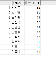 Quiz. 2학년 학생의 이름, 몸무게를 출력하고 몸무게를 내림차순으로 출력하기