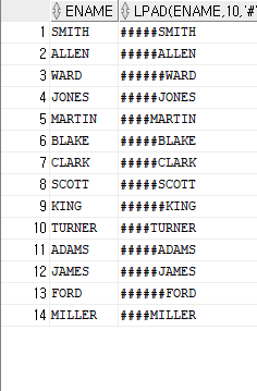 10. rpad : 오른쪽에 문자를 추가해줍니다. rpad(컬럼 또는 문자열, 전체자리수, 채울문자)